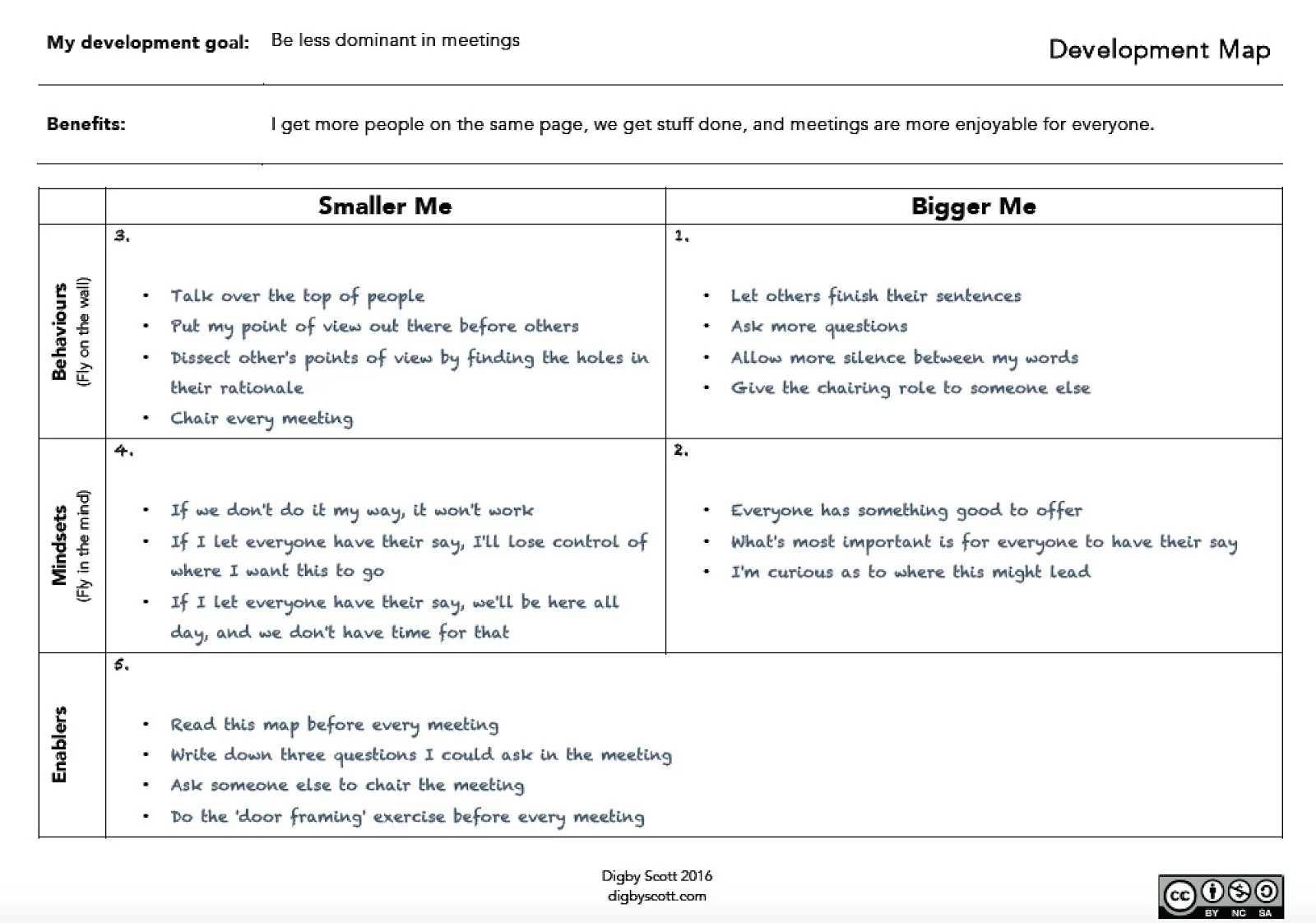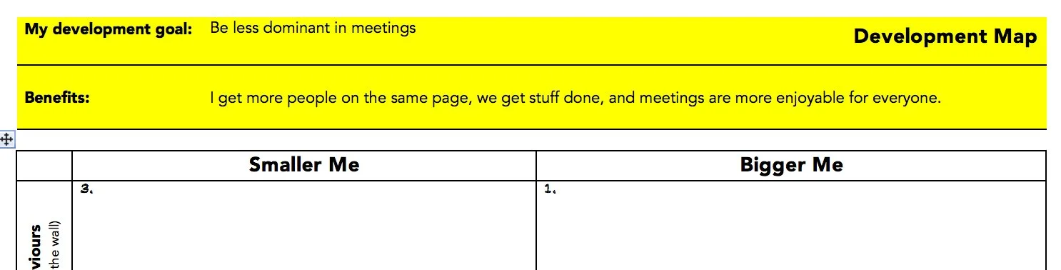 You’ll need some sort of development goal in mind. An idea of the sort of person you want to become. Maybe more influential. Maybe more patient with less competent people. Less dominating in meetings. More confident with senior management. Greater comfort with ambiguity. Pick something that’s important to you. At the top of the template, write down that goal, and the benefits of being that way.