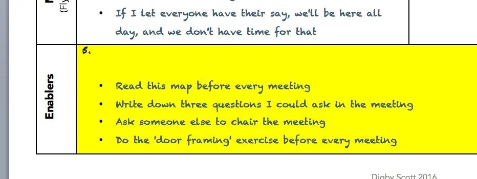 Now complete the same steps for the left hand side. Start with box 3. The behaviours you want to let go of, or at least ‘dial down’. What would a fly-on-the-wall typically seeing you doing now? In the example, we could have: