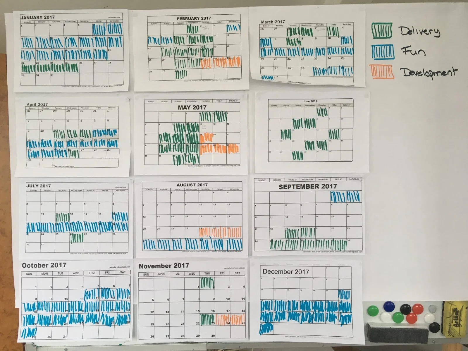 Next, I schedule the good stuff. Steven Covey calls this putting the ‘big rocks in the jar first’. I’m a big picture kind of guy, so I’ll make a big calendar and put it up on my whiteboard in my office. Here’s what that looks like: