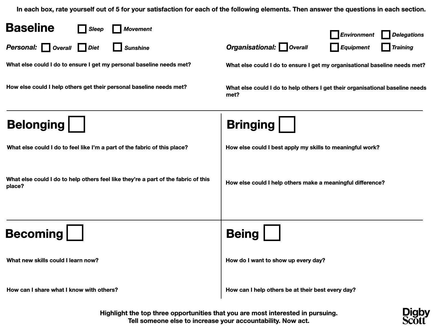 It’s a self-assessment that helps to identify where you’re good, and where things might need shoring up. It invites you to rate each element, and then identify how you might strengthen each one, both for you, and for others.